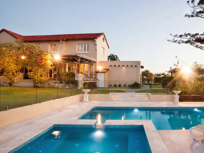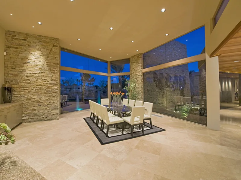 - Terrassenplatten und Poolumrandungen: Im Außenbereich überzeugt Travertin durch seine Rutschfestigkeit (in offenporiger/getrommelter Ausführung) und heizt sich in der Sonne weniger stark auf als dunkle Gesteine.